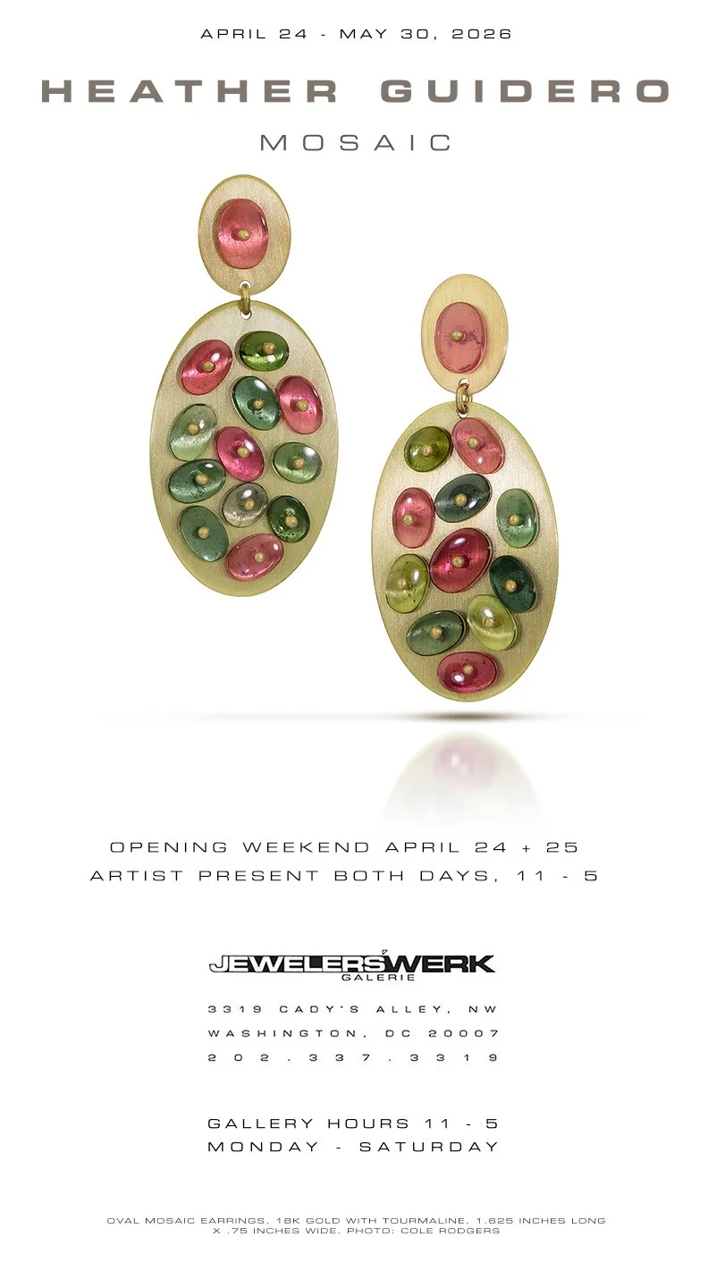 HEATHER GUIDERO Friday, April 24, 2026 6:30 AM 06:30 Saturday, May 30, 2026 7:30 AM 07:30 Jewelers'werk Galerie 3319 Cady's Alley, NW Washington, DC 20007 USA (map) Google Calendar ICS HEATHER GUIDEROAPRIL 24 - MAY 30, 2026